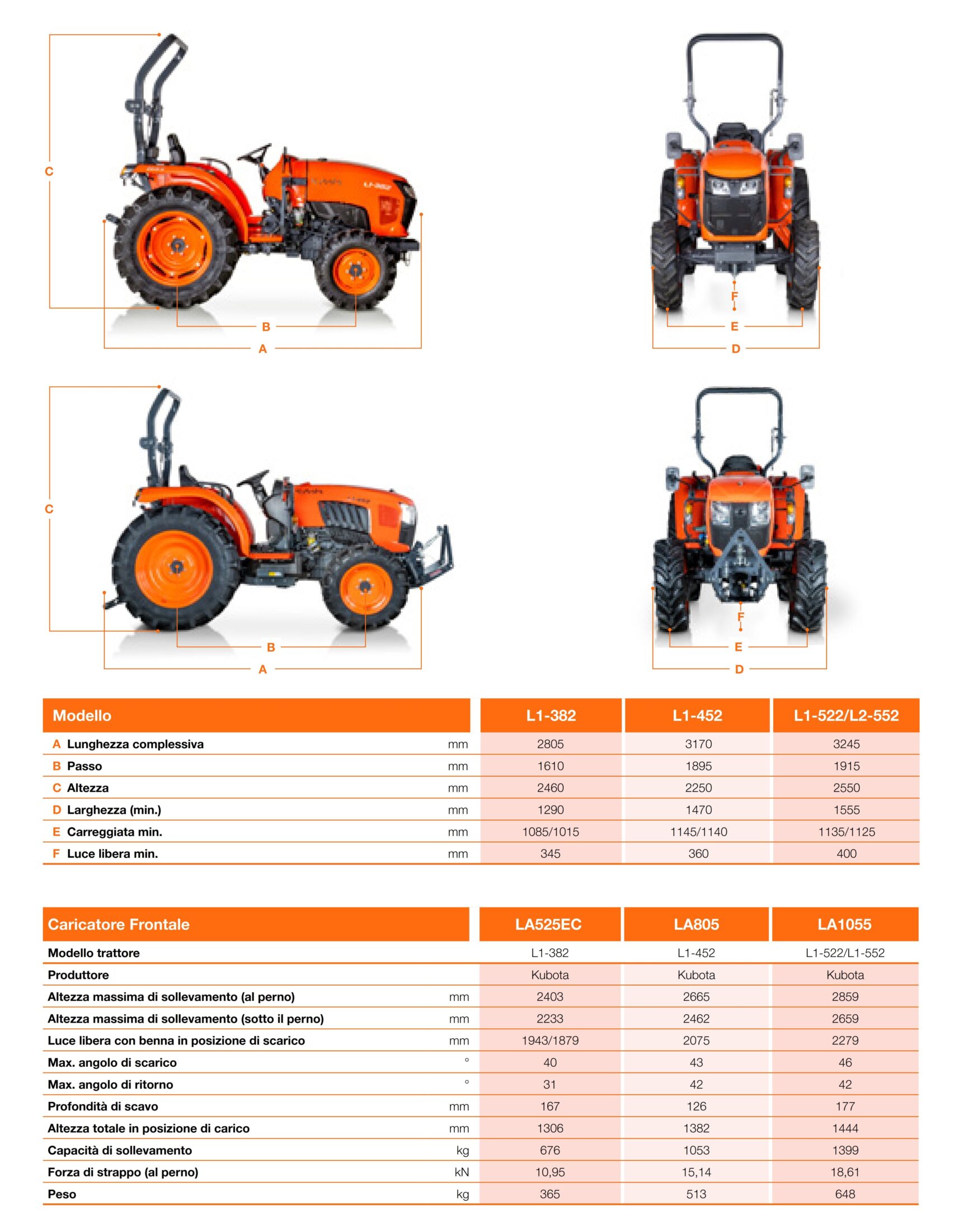 | Altezza con arco di protezione | 2460/2355 | 2460 | 2250 | 2550 | 2250 | 2550 | 2420 (con cabina) |